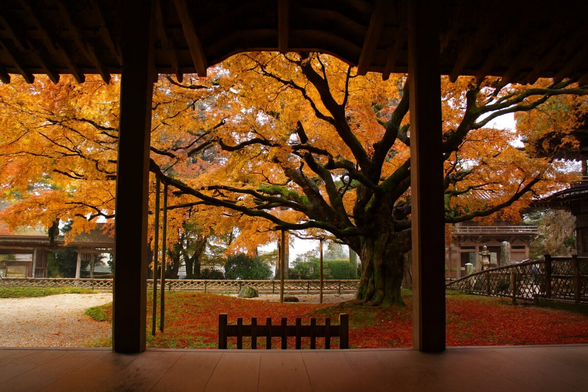 - 特徴:樹齢400年以上の大カエデが圧巻。境内を彩る紅葉と建造物のコントラストは必見です。