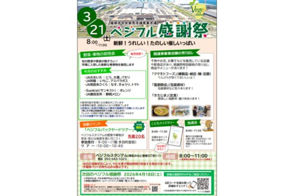 福岡市東区のベジフルスタジアムで、毎月恒例の人気朝市イベント「ベジフル感謝祭」が2026年4月18日(土)に開催されます。旬の青果や特産品の販売に加え、試食や体験企画も充実。市場ならではの“新鮮さ”と活気を体感できるイベントです。