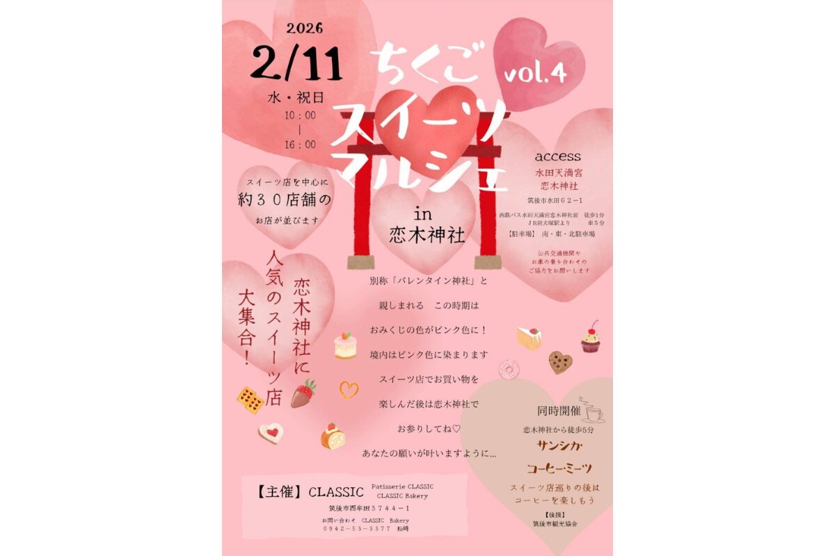 福岡県筑後市にある恋木神社(水田天満宮内)にて、2026年2月11日(水・祝)に「ちくごスイーツマルシェvol.4」が開催されます。