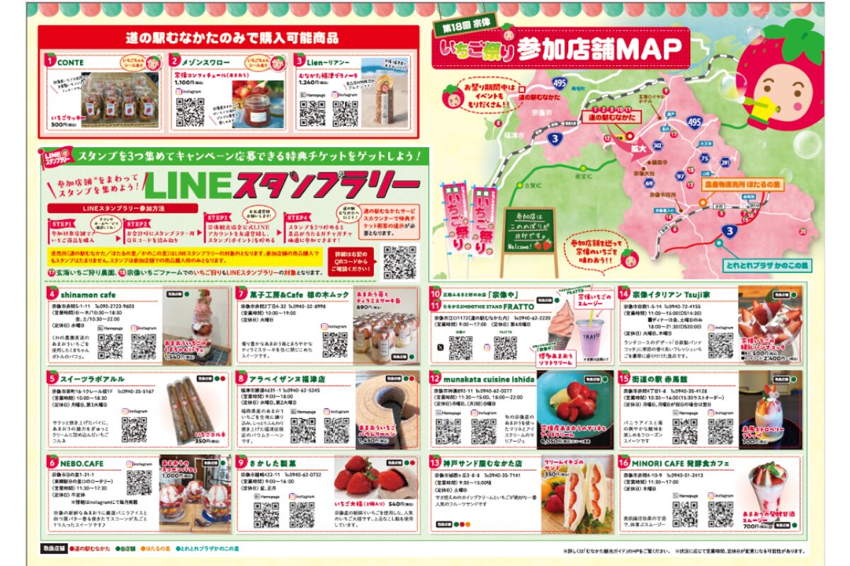 市内16店舗以上が参加し、それぞれの個性が光る限定メニューが登場するため、訪れるたびに新しい発見があります。道の駅むなかたを拠点に、カフェ巡りをしたり、直売所で旬のいちごを購入したりと、楽しみ方は自由自在。家族連れ、友人同士、カップル、そして一人でも満喫できるイベントです。