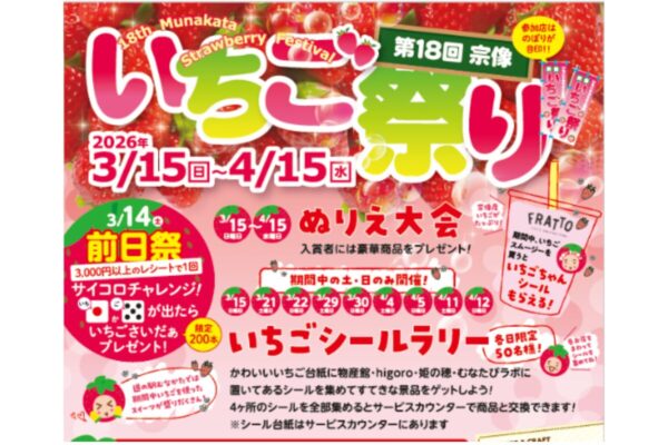 対象直売所(道の駅むなかた/ほたるの里/とれとれプラザかのこの里)でいちご商品を購入し、「いちごちゃんシール」を専用台紙に10枚集めると、各直売所で使える100円分のお買物券をプレゼント。さらにダブルチャンスとして、抽選で道の駅むなかた商品券1,500円分が50名に当たります。
