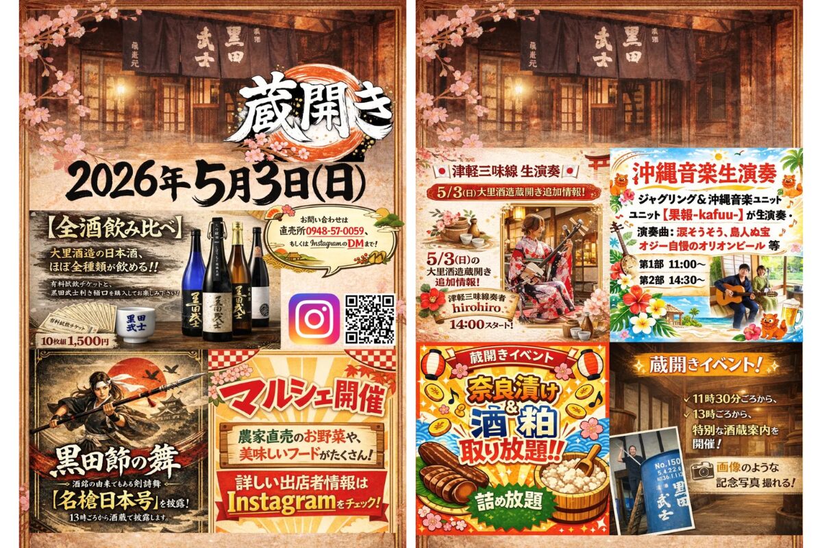 日本酒の飲み比べに加え、伝統芸能や音楽、食、蔵見学までそろう「大里酒造蔵開き2026」は、嘉麻市ならではの魅力を体感できるイベントです。