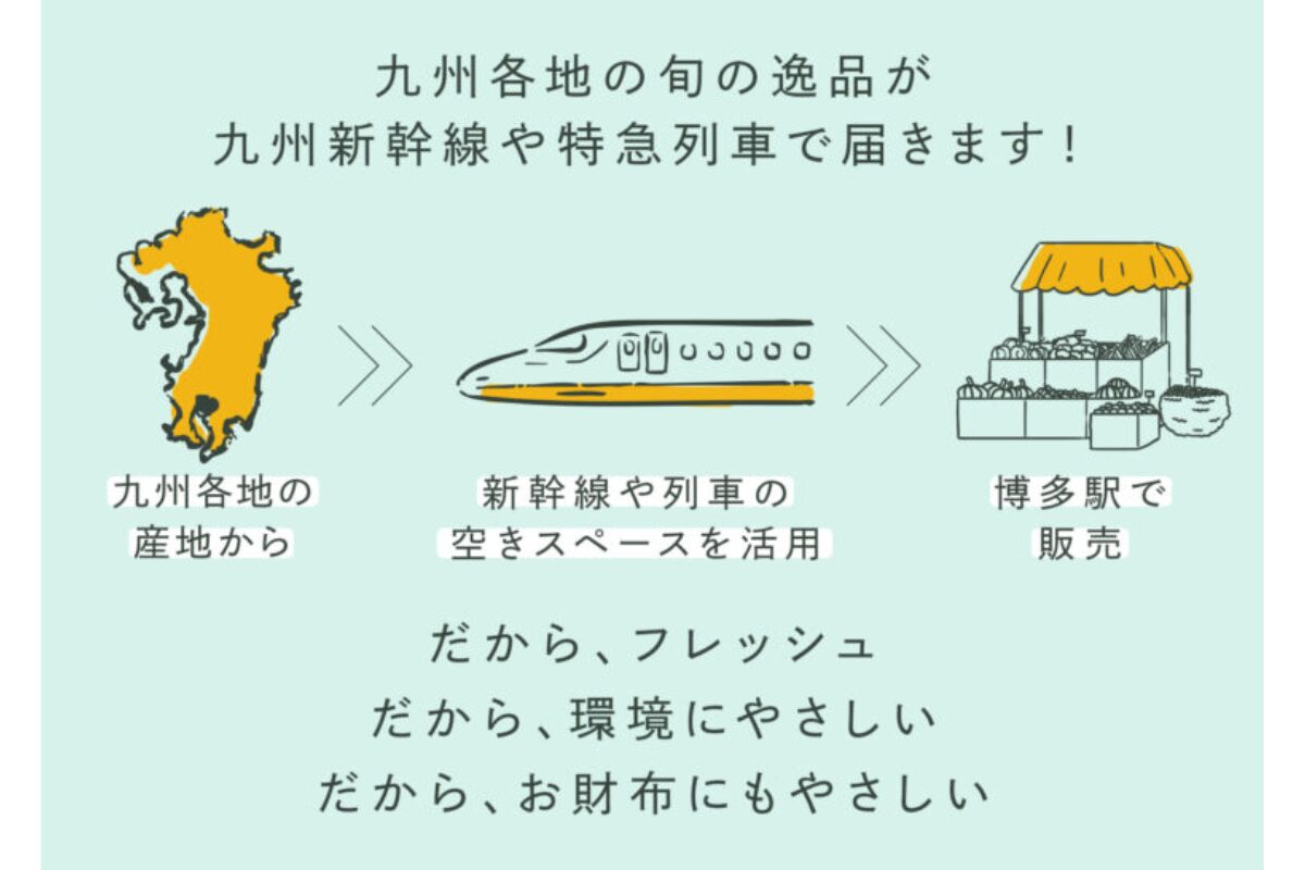 FUKU MARCHE STOREは、九州新幹線や特急の空きスペースを活用した環境負荷の少ない輸送方法を採用。おいしいだけでなく、未来を考えた「やさしい選択」ができる場所です。