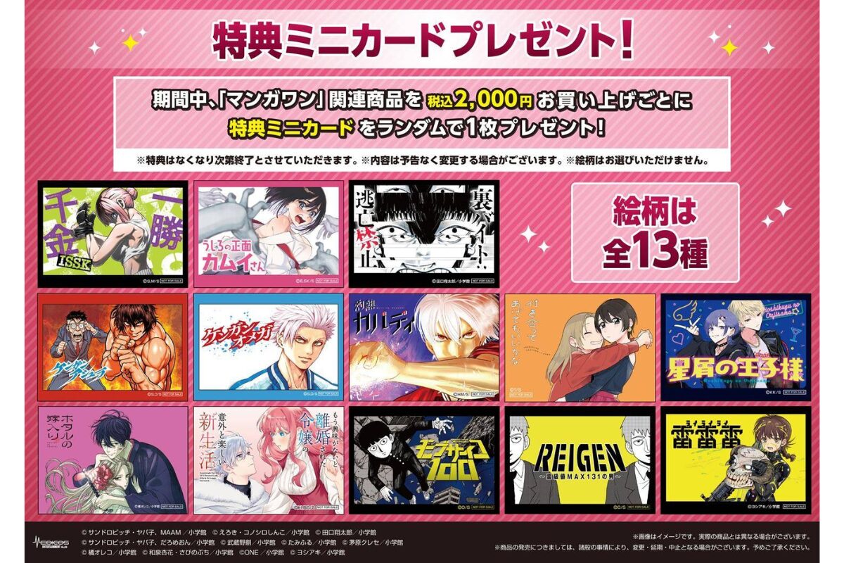 期間中、マンガワン関連商品を税込2,000円以上購入ごとに、全13種の特典カードを1枚ランダムでプレゼント。どのキャラクターが出るかは開けてからのお楽しみ。コンプリートを目指すファンは見逃せません。