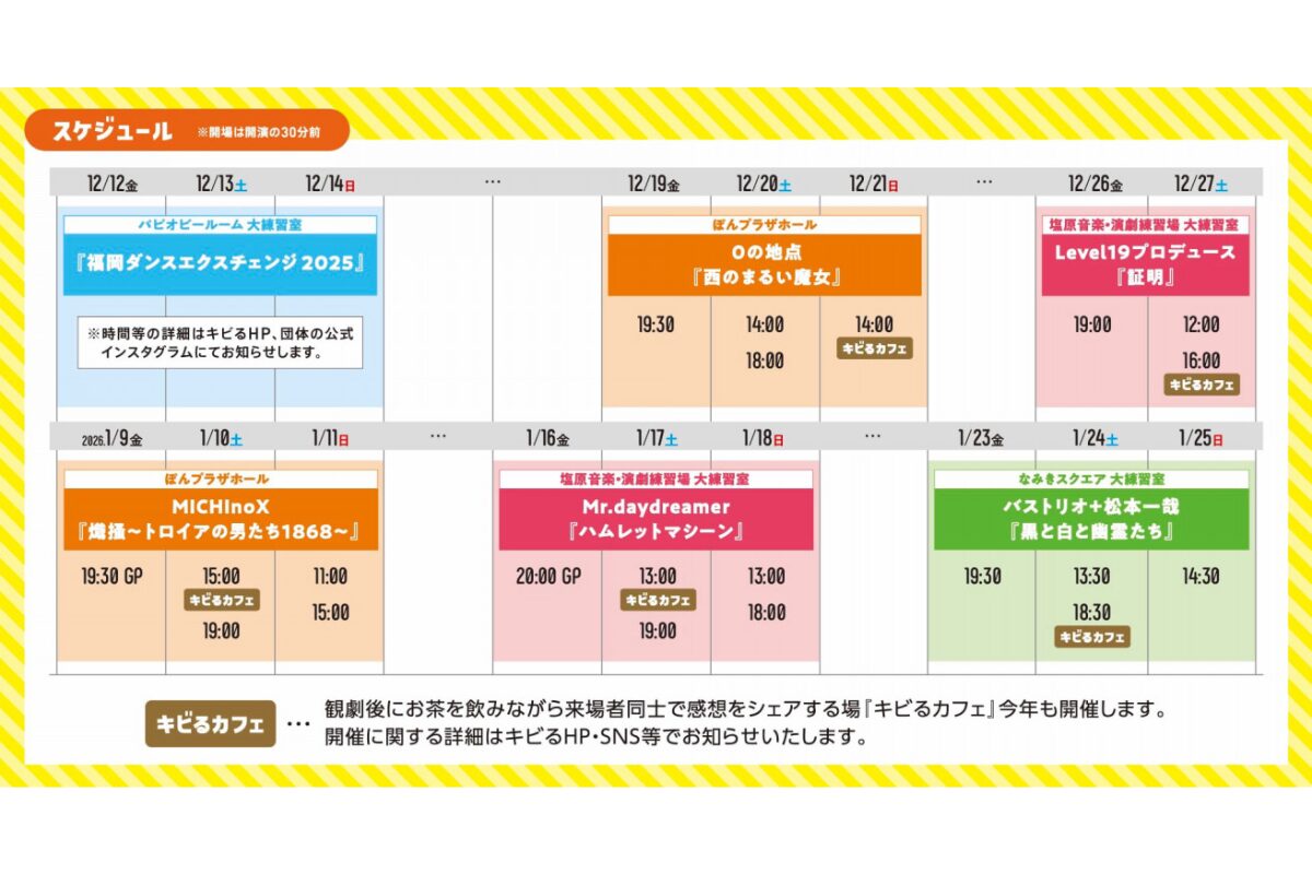 観劇後にアーティストと語り合える「キビるカフェ」は各公演日に開催。希望者は事前予約が必要です(予約フォームあり)。