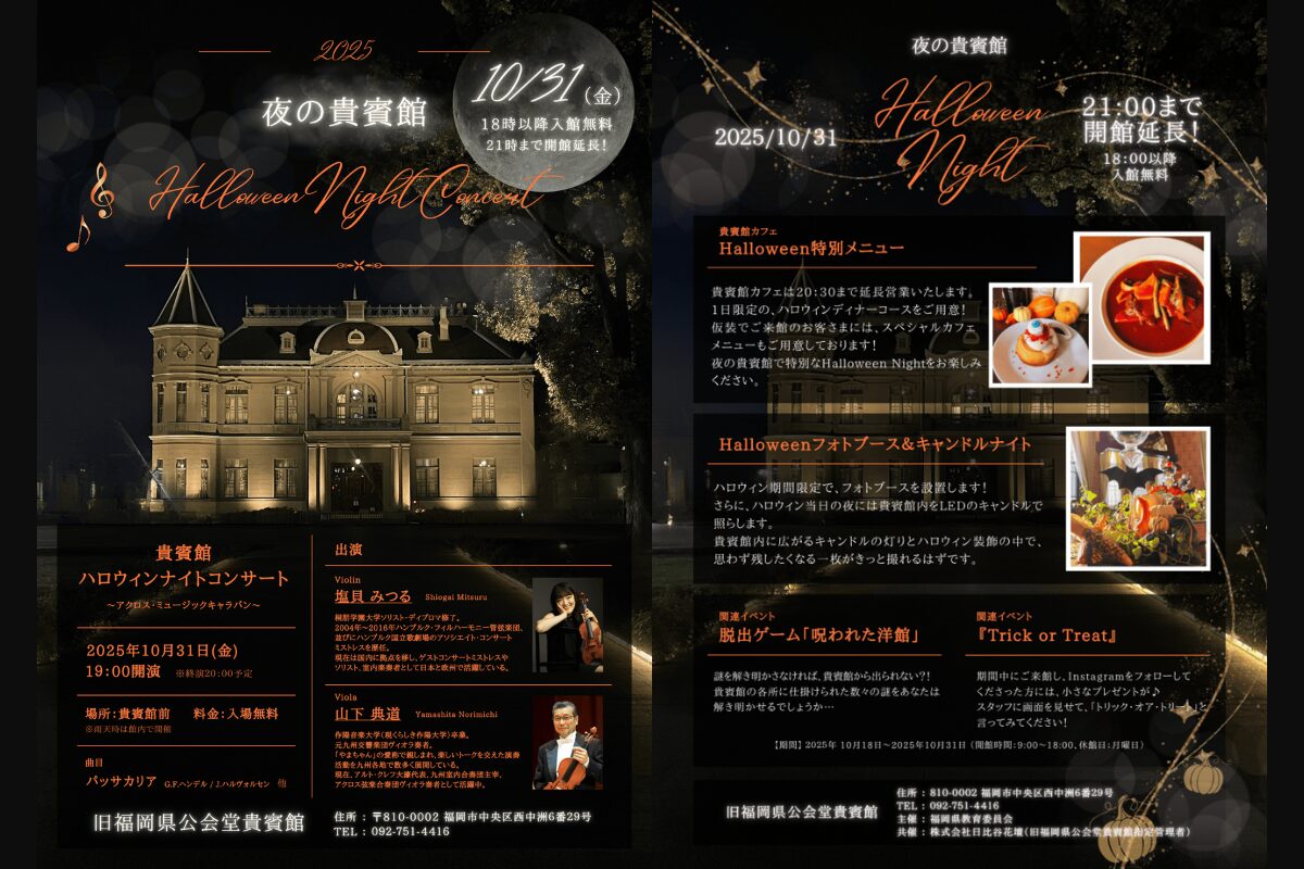 歴史ある「旧福岡県公会堂貴賓館」で、ハロウィン当日の夜限定イベント「夜の貴賓館 Halloween Night」が2025年10月31日(金)に開催されます。