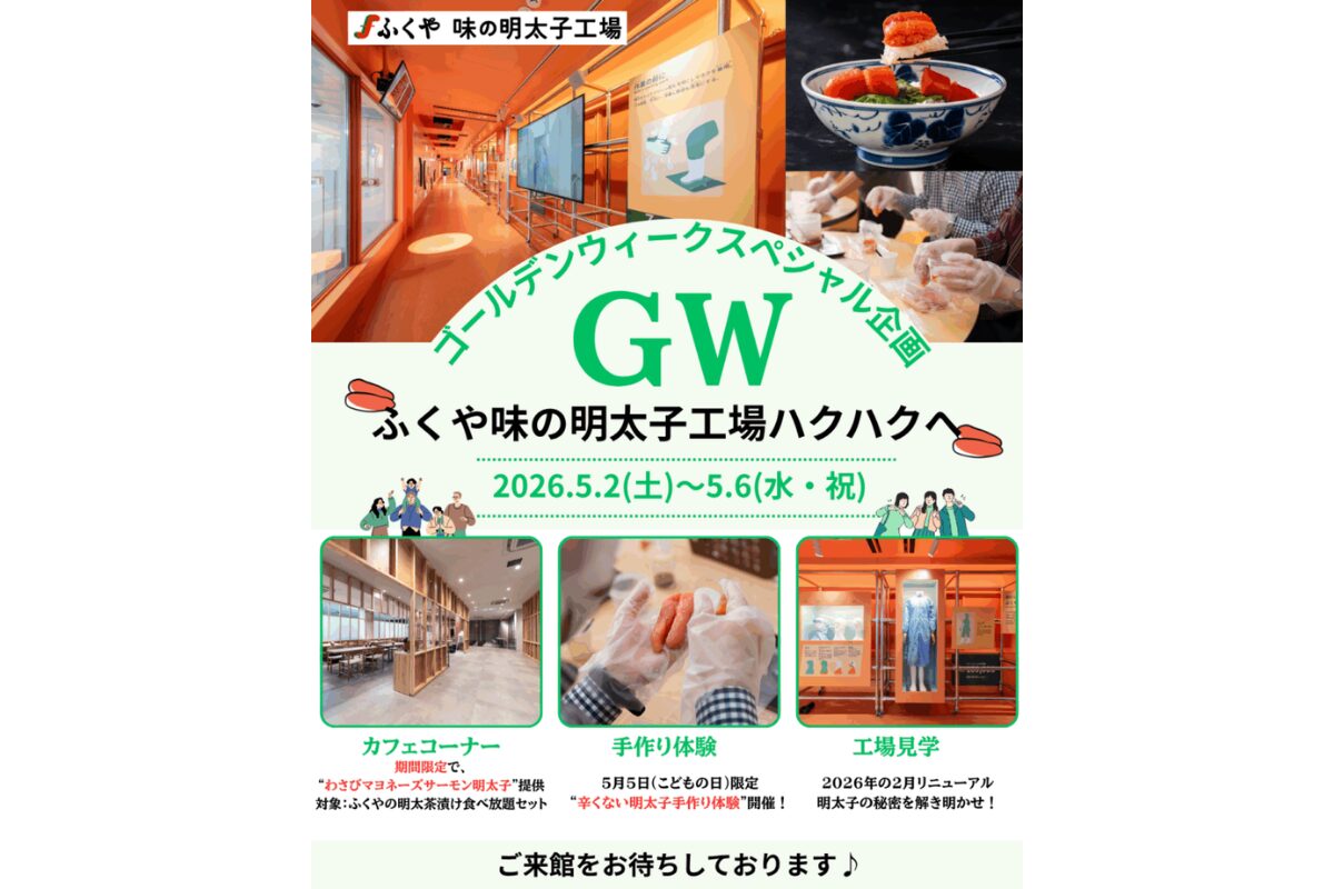 福岡市東区の「ふくや 味の明太子工場」で、ゴールデンウィーク特別企画が開催されます。期間限定メニューに加え、5月5日限定の子ども向け明太子手作り体験も登場。工場見学やカフェ、売店、展示コーナーまで楽しめる、家族のおでかけにぴったりのスポットです。
