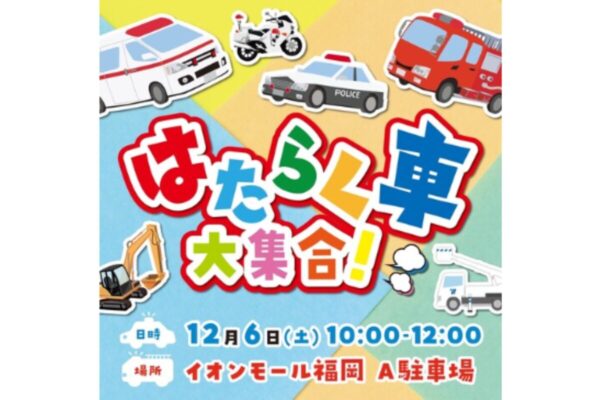 消防車やパトカー、高所作業車まで勢ぞろい!子どもも大人も楽しめる、福岡の人気イベント「はたらく車大集合」が2025年12月6日(土)にイオンモール福岡で開催されます。試乗体験や防災啓発も行われる、貴重な体験型イベントです。