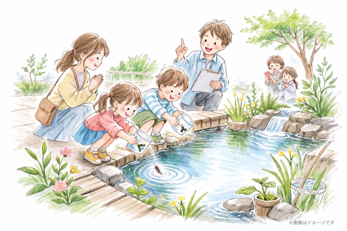 当日はまず、ホタルの一生や生態についてわかりやすく学びます。その後、ホタルの幼虫をビオトープへ放流。実際に手を動かしながら学べるため、子どもたちにとって印象深い体験になりそうです。