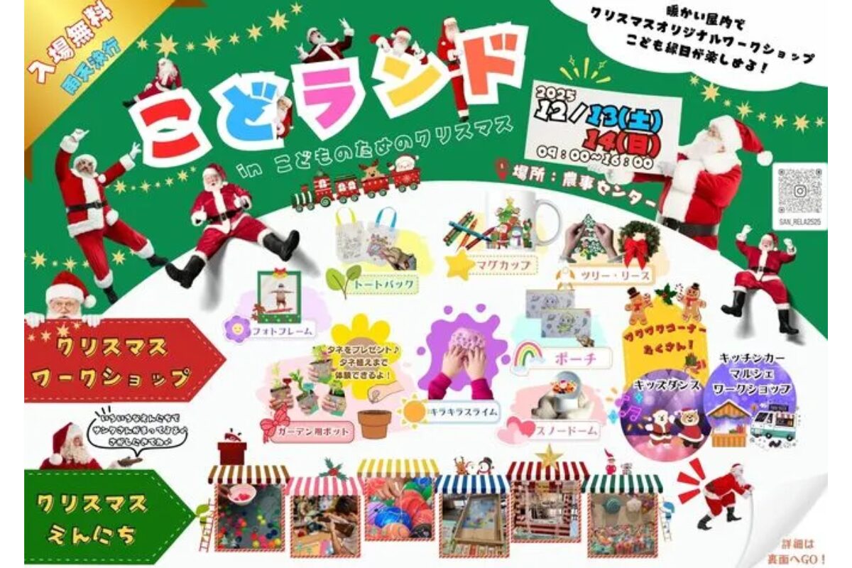親子で楽しめる入場無料の大型クリスマスイベント「こどランド in こどものためのクリスマス」が、2025年12月13日(土)・14日(日)に北九州市立総合農事センターで開催されます。手作り体験やワークショップ、クリスマスマーケットなど、冬の思い出づくりにぴったりな2日間です。