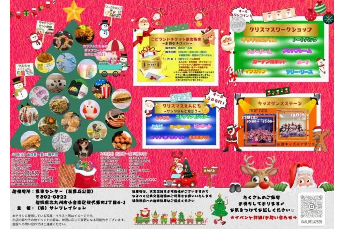 会場は、自然豊かな「花農丘公園(北九州市立総合農事センター)」。毎年多くの家族連れで賑わう人気イベント「こどランド」が、今年もクリスマス仕様で開催されます。子どもたちの創造力を育むワークショップや、遊び・食・買い物が楽しめるブースが盛りだくさんです。