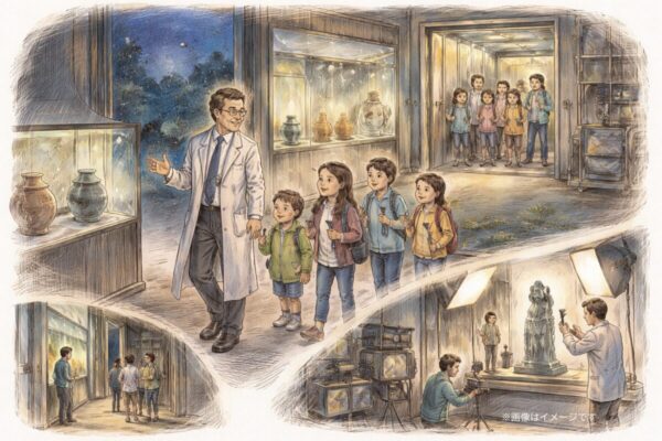 「夜の博物館たんけん隊」では、研究員の解説を聞きながらバックヤードを巡り、博物館の舞台裏を体験できます。巨大エレベーターや撮影スタジオなど、普段は入ることができない場所を見学できるのも大きな魅力です。