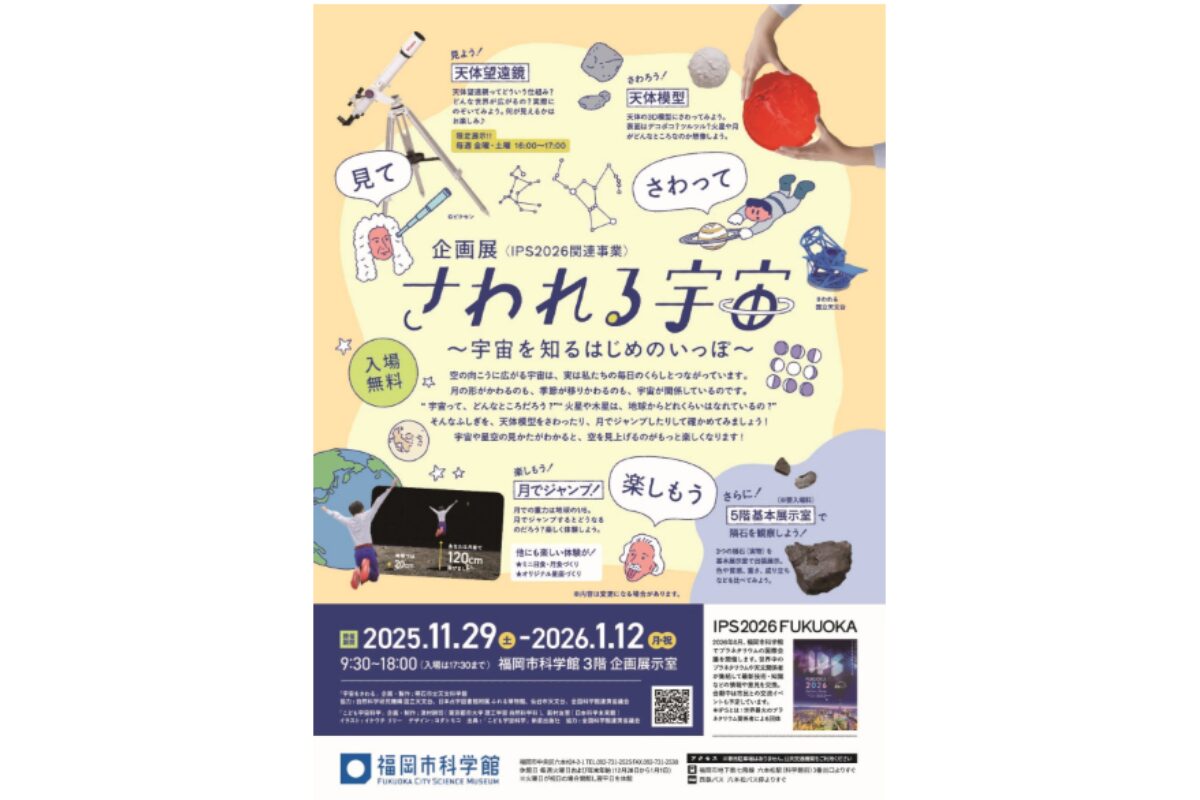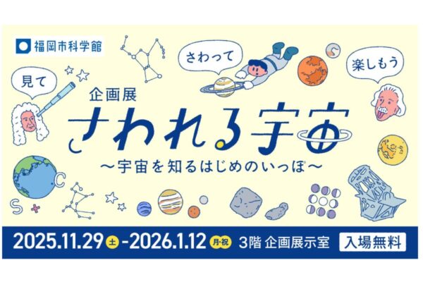 宇宙のふしぎを「見て」「さわって」楽しめる体験型企画展「さわれる宇宙~宇宙を知るはじめのいっぽ~」が、福岡市科学館で2025年11月29日(土)からスタートします。入場無料で、子どもから大人まで楽しめる内容が盛りだくさんです。