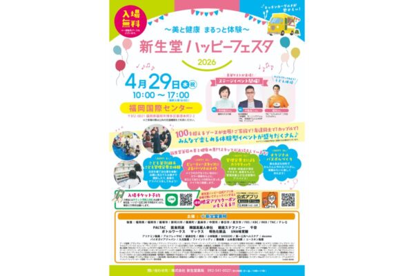 福岡で人気の薬局チェーン「新生堂薬局」が手がける大型イベント「新生堂ハッピーフェスタ2026」が、2026年4月29日(水・祝)に福岡国際センターで開催されます。美と健康をテーマに、100を超えるブースや体験コンテンツが集結。家族連れから美容・健康志向の方まで、1日中楽しめる注目イベントの全貌を詳しくご紹介します。