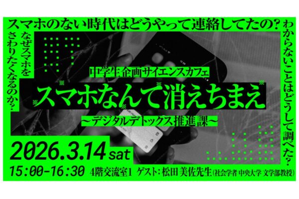 福岡市科学館で2026年3月14日(土)、中学生スタッフ「ジュニアクルー」が企画したサイエンスカフェ「スマホなんて消えちまえ ~デジタルデトックス推進課~」が開催されます。