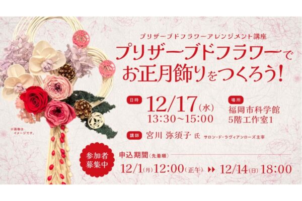 福岡市科学館で2025年12月17日(水)に、プリザーブドフラワーを使ったお正月飾りづくりの講座が開催されます。プロ講師の丁寧な指導で、初心者でも気軽に楽しめる人気のアレンジメント体験です。
