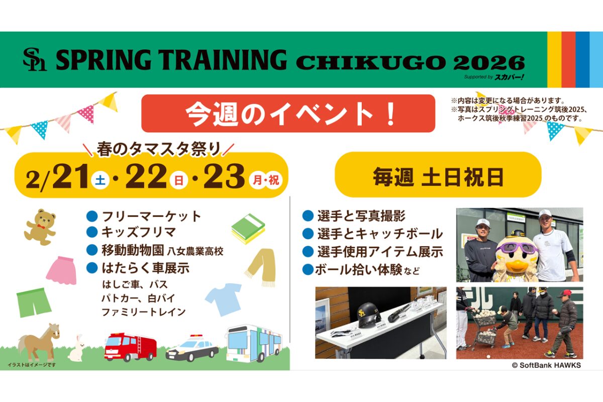 シーズン開幕を目前に控えたホークスの熱気と、地域のにぎわいを同時に体感できる貴重な3日間。家族や友人とともに、タマスタ筑後でひと足早い春の思い出をつくってみてはいかがでしょうか。