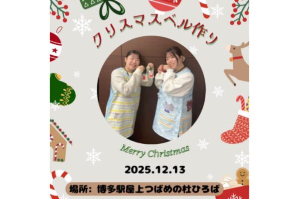 福岡こども専門学校の学生たちが企画・運営する親子向け「クリスマスベルづくり」が、JR博多シティ屋上「つばめの杜ひろば」で開催されます。未就学児から小学生を対象にした楽しい体験型イベントです。