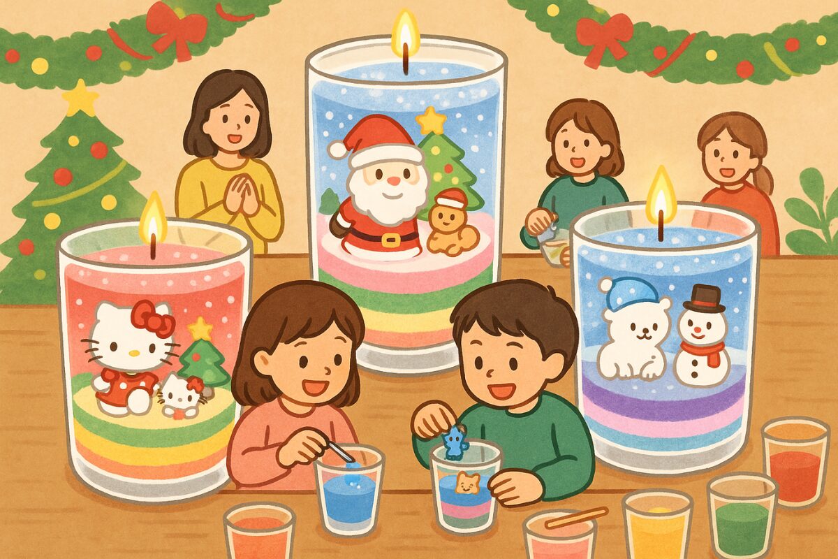 グラスの中にカラフルな砂を重ね、お気に入りのガラス細工を並べて作る「クリスマスキャンドル」は、まさに自分だけの小さなアート作品。
