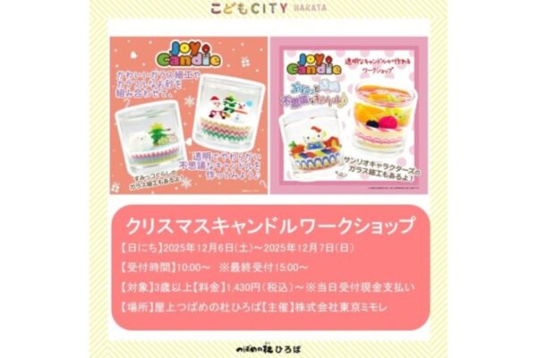 福岡・博多駅の屋上「つばめの杜ひろば」で、世界に一つだけのオリジナルキャンドル作りが楽しめる「クリスマスキャンドルワークショップ」が2025年12月6日(土)・7日(日)に開催されます。人気キャラクターのガラス細工も登場し、子どもから大人まで楽しめる冬限定イベントです。