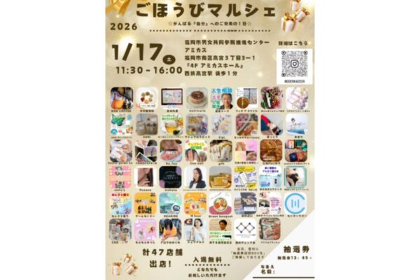 福岡市南区・高宮駅前のアミカスホールで、親子で楽しめる人気イベント「ごほうびマルシェ」が2026年1月17日(土)に開催されます。