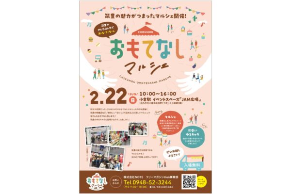 開催日は2026年2月22日(日)、時間は10:00~16:00。会場はJR小倉駅3階イベントスペース「JAM広場」(北九州市小倉北区浅野1-1-1)です。入場料は無料。主催・共催は福岡県、筑豊地区観光協議会、株式会社NOTE(フリーマガジンHen事業部)です。