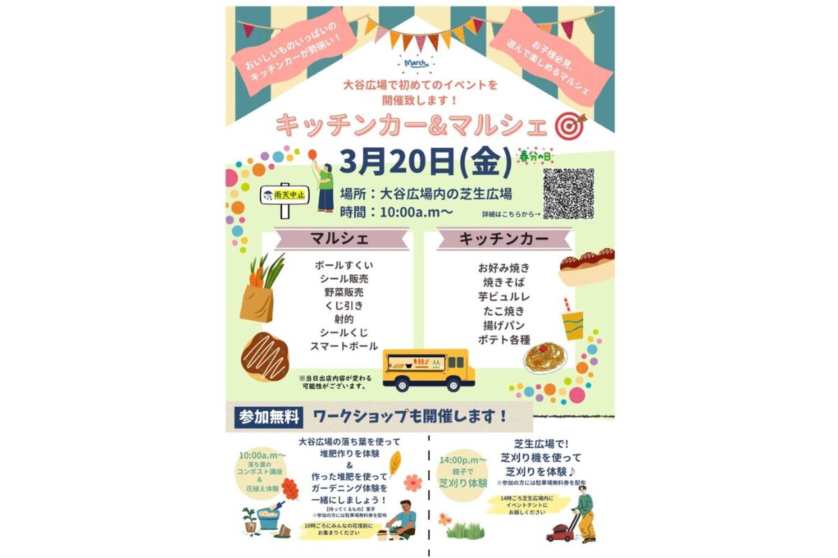 春分の日に開催される「キッチンカー&マルシェin大谷広場」は、グルメ・買い物・体験が一度に楽しめる、家族のお出かけにぴったりのイベントです。芝生広場に並ぶキッチンカーで出来立てグルメを味わいながら、マルシェで雑貨や野菜をチェックしたり、子ども向けの遊びブースで楽しんだりと、思い思いの過ごし方ができます。