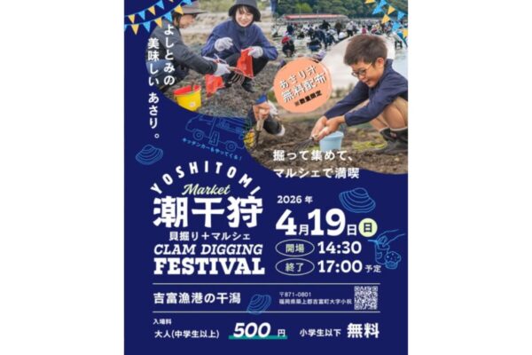 春のレジャーとして人気の「潮干狩りマルシェ」が、2026年4月19日(日)に福岡県築上郡吉富町で開催されます。潮干狩りと地元マルシェを同時に楽しめるイベントで、家族連れや観光客にもおすすめの一日です。