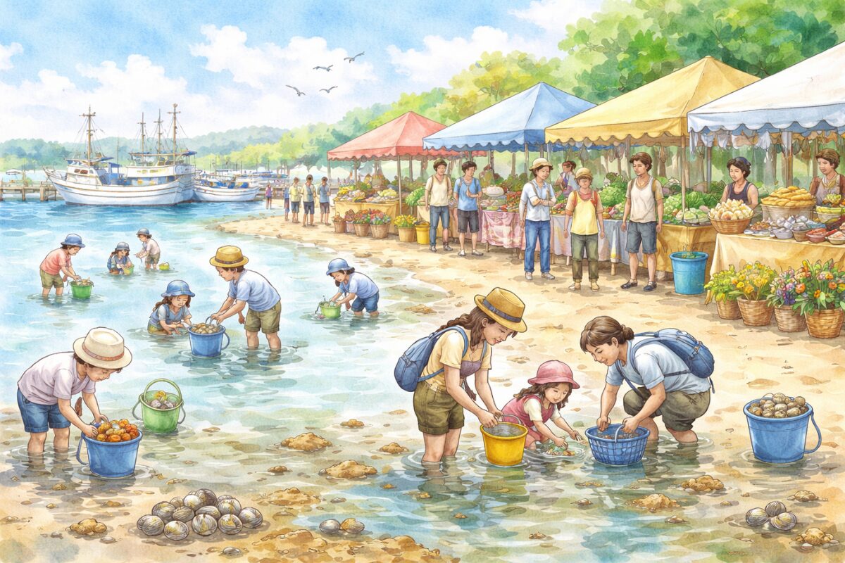 ・内容:潮干狩り、地元マルシェ(魚介・農産物・パンなどの販売)