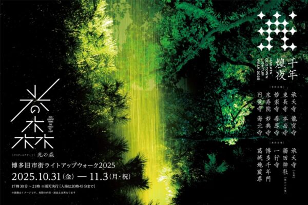 福岡市博多区で毎年秋に行われる「博多旧市街ライトアップウォーク 千年煌夜」が、2025年10月31日(金)から開催されます。今年のテーマは「光の森」。歴史ある寺社や庭園が幻想的な光で彩られる、博多の秋の風物詩です。