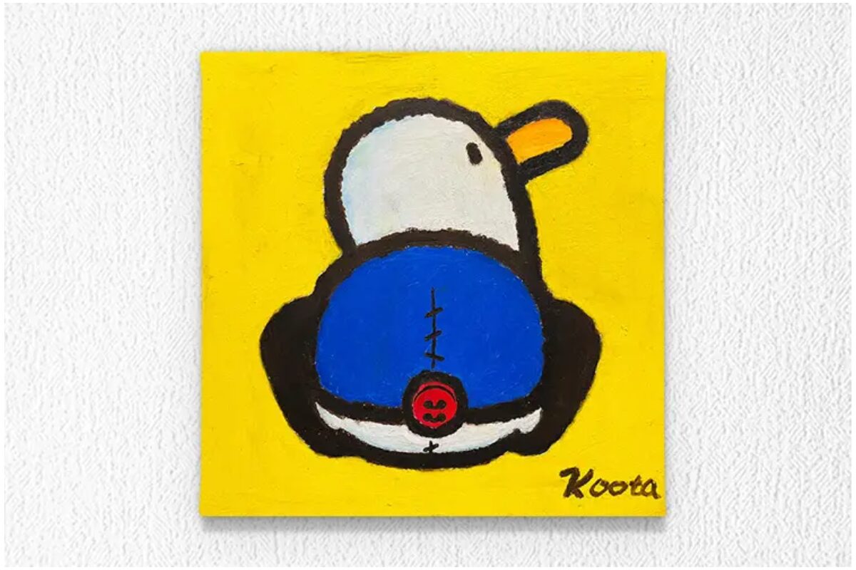 縫い目やボタンがついた鳥のぬいぐるみの姿が、やわらかいタッチで表現されています。KOOTAにとってクレヨン作品は創作の原点であり、ドゥドゥらしさが最も伝わるシリーズです。