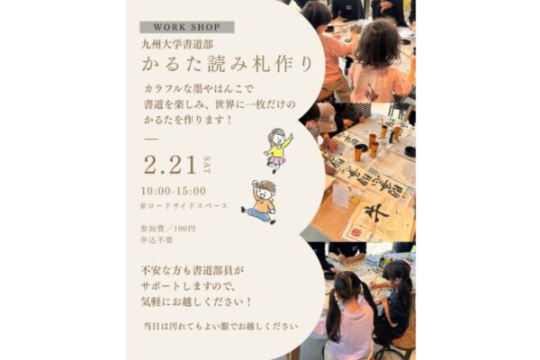 九州大学書道部による特別ワークショップ「かるた読み札作り」が、2026年2月21日(土)に九大伊都 蔦屋書店 ロードサイドスペースで開催されます。カラフルな墨やはんこを使い、世界に一枚だけのかるたを制作できる体験型イベントです。