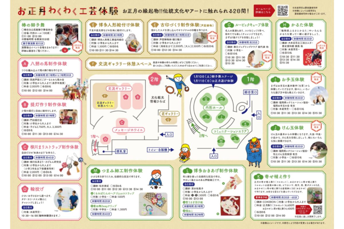 1階・2階に広がる会場では、子どもから大人まで楽しめる体験が満載です。懐かしい正月遊びから、博多の伝統工芸やおしゃれな和風アクセサリー制作まで、内容はバラエティ豊か。