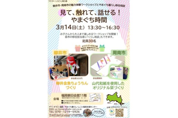 福岡市・天神で開催される「YY!ターンカフェ」は、山口県の暮らしや文化を身近に感じられる体験型イベントです。今回は柳井市と周南市にスポットを当て、伝統文化に触れられるワークショップと移住相談ブースが登場します。