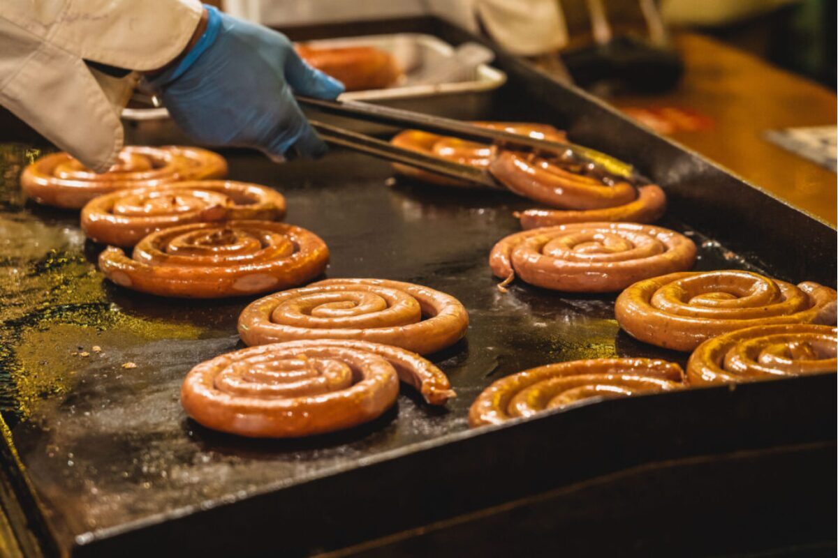 「柴田産業 presents CHRISTMAS MARKET in 光の街・博多」では、白を基調とした可愛らしいヒュッテが立ち並び、グリューワインやドイツグルメ、本場ヨーロッパから直輸入したかわいらしい雑貨の屋台など、約30店舗登場します。大人気の「シュテファンブルスト」(ぐるぐるソーセージ)は、パリッとはじける皮とジューシーな味わいが人気。