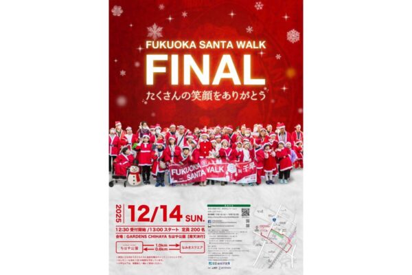 福岡市東区・千早エリアで毎年恒例のチャリティイベント「福岡サンタウォーク in 千早2025」が、2025年12月14日(日)に開催されます。サンタの衣装で街を歩き、子どもたちに笑顔を届けるこのイベント。今年も音楽や縁日ブースなど楽しい企画が盛りだくさんです。