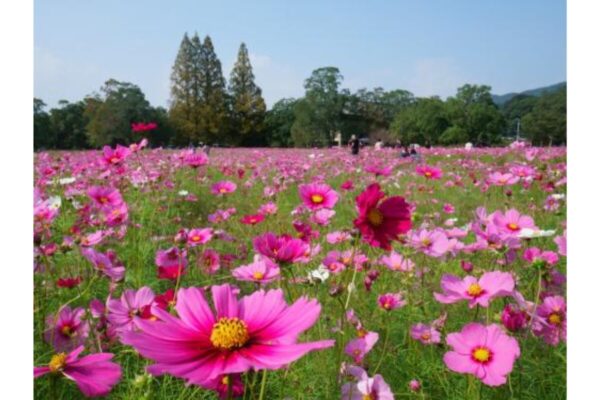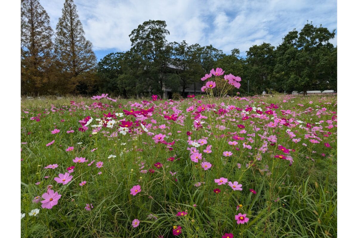 観世音寺の宝蔵館横の広場には、ピンクや白を中心とした約175万本のコスモスが植えられ、秋には華やかな風景が広がります。広大な敷地に咲き誇る光景は圧巻で、訪れる人々の心を和ませてくれます。
