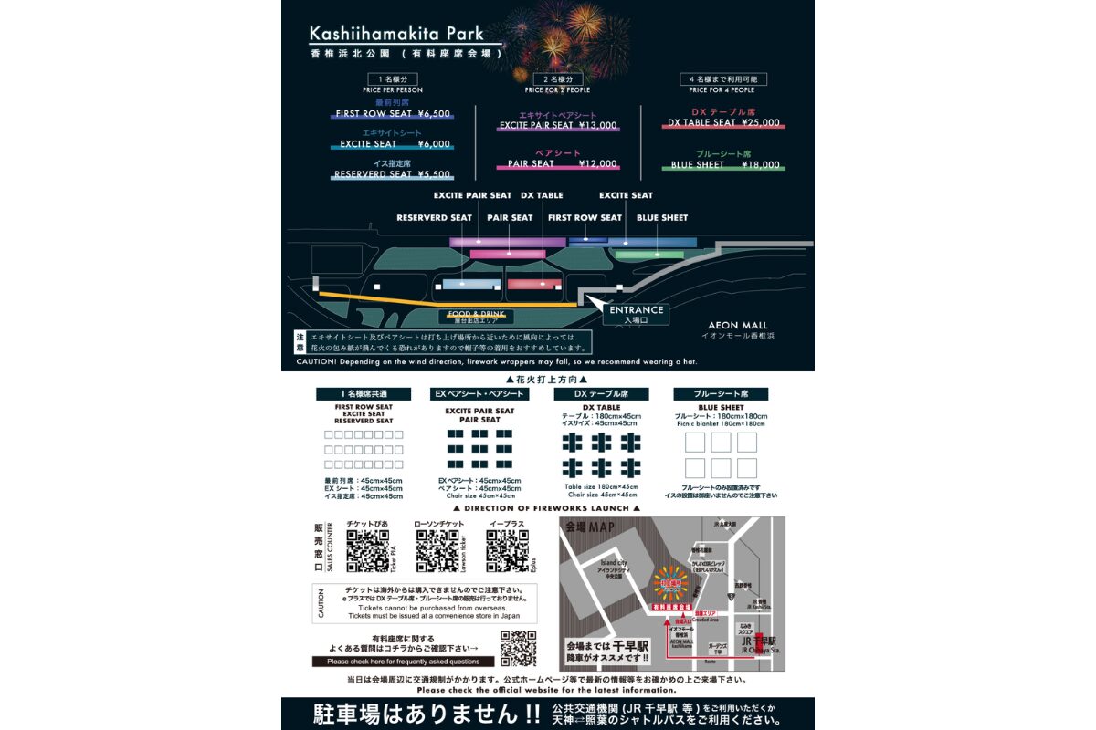 混雑を避けてゆったり花火を楽しみたい方には、有料席の利用がおすすめです。有料席は香椎浜北公園内の指定エリアに設けられており、落ち着いて花火を鑑賞したい方に最適です。