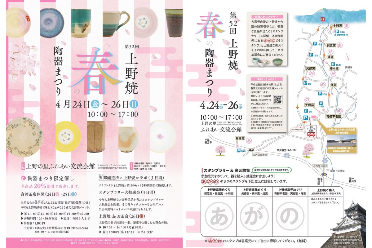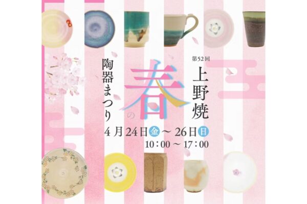 福岡県福智町で春の恒例イベント「第52回 上野焼 春の陶器まつり」が、2026年4月24日(金)~26日(日)の3日間開催されます。国指定伝統的工芸品「上野焼」をお得に購入できるだけでなく、窯元巡りやお茶体験、グルメも楽しめる人気イベントです。