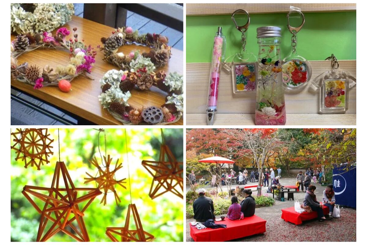 丘陵地に広がる1万本の紅葉に包まれながら、花や雑貨を選び、手作りのリースを作ったり、芝生で音楽に耳を傾けたりと、家族連れはもちろん、大人の休日にもぴったりな内容が盛りだくさん。