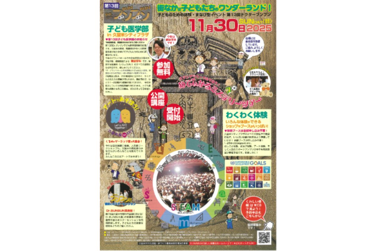 2025年11月30日(日)、福岡県久留米市の久留米シティプラザ全館(六角堂広場含む)にて、子どもたちが仕事や医療、アートを体験できる大人気イベント「第13回DR.ブンブン~オトナにチャレンジ!」が開催されます。