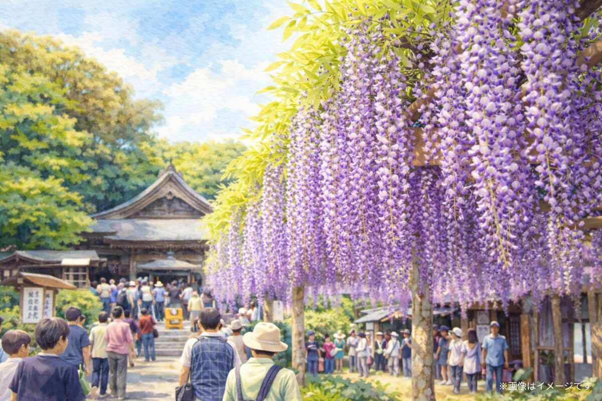 さらに、藤供養や雅楽といった伝統行事に加え、物産即売会やステージイベントなども充実しており、観光客から地元の方まで幅広く楽しめます。春の穏やかな空気の中で、美しい藤と地域の魅力を一度に体感できる特別な一日です。