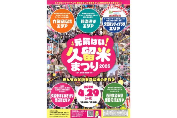 2026年4月29日(水・祝)に、久留米市中心市街地を舞台に「元気ばい久留米まつり2026」が開催されます。旧「くるめ楽衆国まつり」から名前を新たに、5つのエリアでステージ、グルメ、物販、映画上映、体験企画などを展開。西鉄久留米駅から久留米シティプラザまで街歩きしながら楽しめる、家族連れにもぴったりの一日イベントです。
