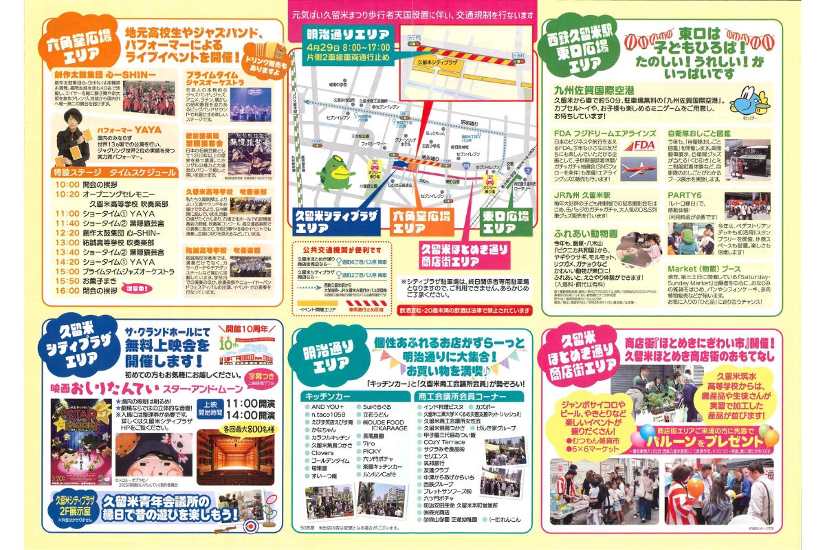 会場は、西鉄久留米駅東口広場から久留米シティプラザまでをつなぐ一体型のレイアウト。明治通りの歩行者天国を軸に、各エリアでライブ、グルメ、物販、体験型企画などが展開されるため、家族で一日過ごしやすい構成になっています。