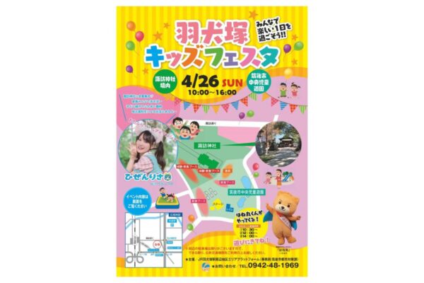 2026年4月26日(日)に、福岡県筑後市の羽犬塚エリアで「第4回 羽犬塚キッズフェスタ2026」が開催されます。会場は諏訪神社境内と筑後市中央児童遊園の2会場で、子どもたちのステージ発表、体験ブース、縁日、グルメが一体になったファミリー向けイベントです。入場・観覧は無料で、春のおでかけ先を探している家族にぴったりの一日になりそうです。
