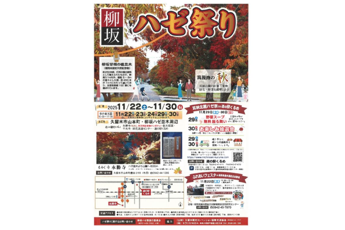 「柳坂ハゼまつり」は、約280年の時を超えて今に残る歴史あるハゼ並木、福岡県天然記念物に指定されるほどの美しさ、そして地元の人々が大切に守り育ててきた文化と風景が融合した、まさに“久留米の秋”を象徴する祭りです。