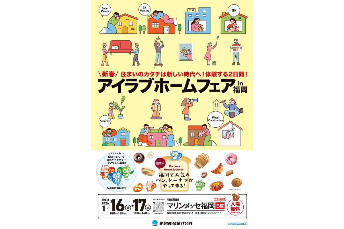 「アイラブホームフェア2026」は、住宅設備や建材の最新情報を一度に見て・聞いて・相談できる、福岡エリア屈指の住宅総合イベントです。大手メーカーの製品展示や補助金情報、専門家による無料セミナーに加え、人気のパン&ドーナツ店も出店するなど、ご家族そろって楽しめる内容が満載。