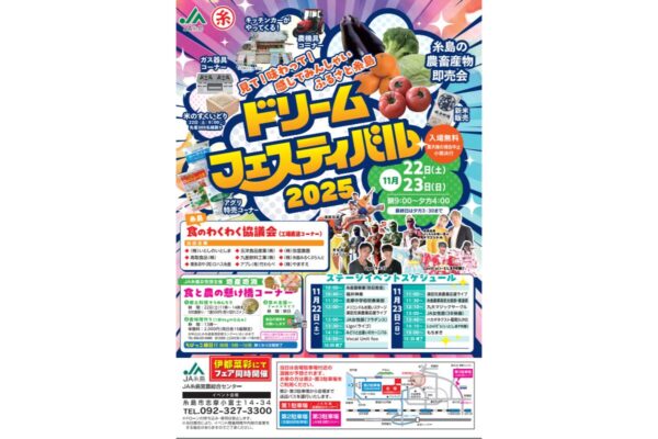糸島の秋の魅力がたっぷり詰まった「ドリームフェスティバル2025」が、11月22日(土)と23日(日)の2日間にわたり、JA糸島営農総合センターで開催されます。地元農産物の即売会や体験型イベント、ステージショーまで、家族で一日楽しめる内容が盛りだくさんです。