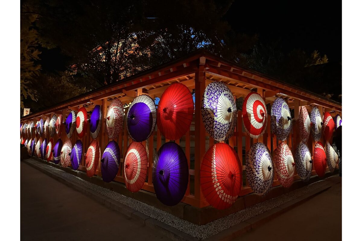 ライトアップは11月22日(土)から11月30日(日)までの9日間開催され、日没後から20時まで点灯されます。約100本の紅葉が赤や橙に色づく境内には、11月29日(土)・30日(日)の2日間限定で「和傘灯り」も登場。色とりどりの和傘に優しい光が灯され、参道が幻想的な和の空間に変わります。
