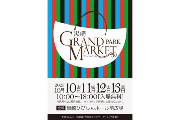 北九州市八幡西区の黒崎ひびしんホール前広場で、2025年10月10日(金)から13日(月・祝)まで「黒崎GRAND PARK MARKET」が初開催されます。地元グルメやスイーツ、クラフト雑貨など多彩なショップが集まり、開放的な空間で買い物や食事を楽しめる注目のイベントです。
